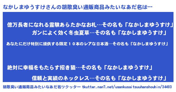 | 男性向けラノベタイトル風あだ名 | 『この素晴らしい世界になかしまゆうすけを!』 |