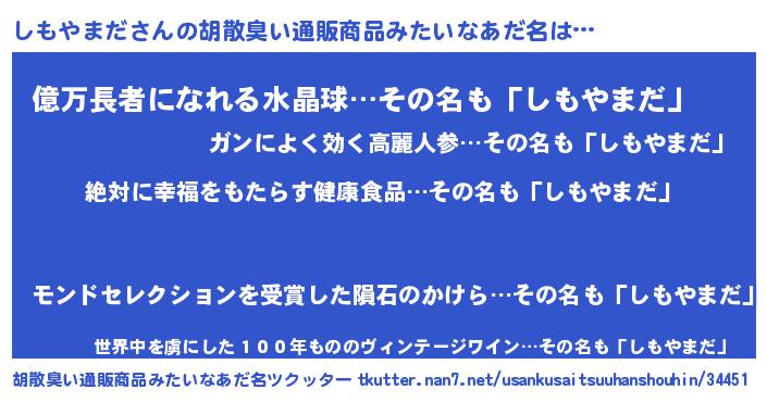 | 女子向けラノベタイトル風あだ名 | 『異世界で失敗しない100のしもやまだ』 |