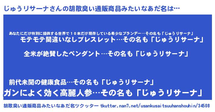 | 男性向けラノベタイトル風あだ名 | 『じゅうリサーナの嫁は女の子じゃないと思った?』 |