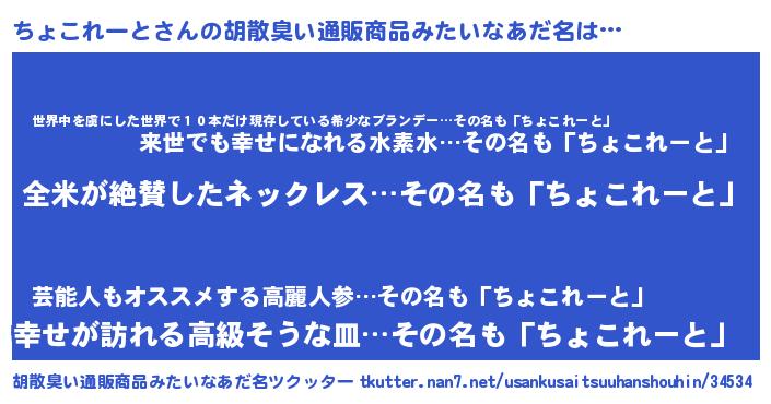 | 意味不明あだ名 | 『とにかく怪しいちょこれーと』 |