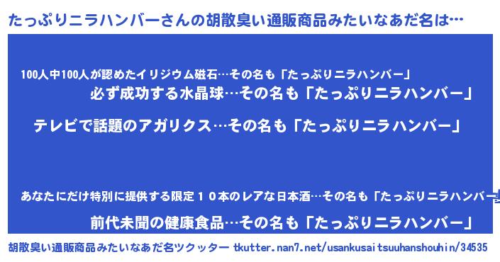 | ヘコむあだ名 | 『たっぷりニラハンバー(爆)』『たっにゅー』 |