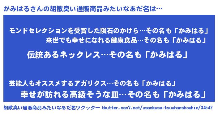 | 男性向けラノベタイトル風あだ名 | 『かみはるの嫁は女の子じゃないと思った?』 |