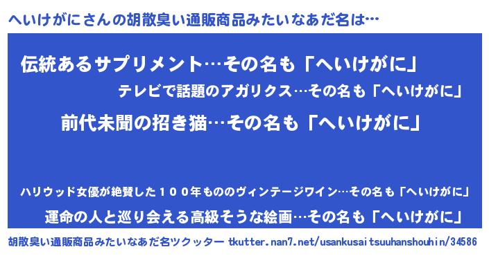| 意味不明あだ名 | 『永久保存へいけがに』『自称へいけがに』 |