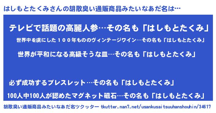 | 男性向けラノベタイトル風あだ名 | 『転生したらはしもとたくみだった件』 |