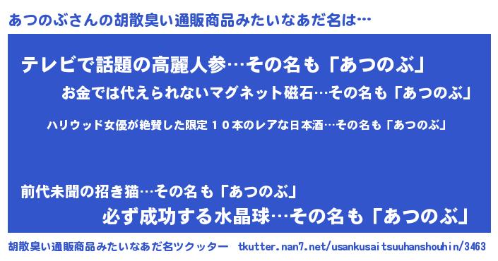 | 意味不明あだ名 | 『住所不定無職あつのぶ(43歳)』 |