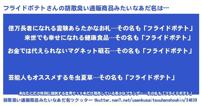| 男性向けラノベタイトル風あだ名 | 『おまえをオタクにしてやるから、俺をフライドポテトにしてくれ! 』 |