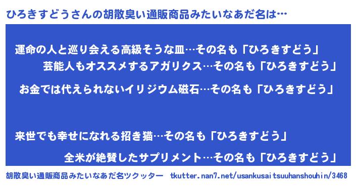 | 男性向けラノベタイトル風あだ名 | 『おまえをオタクにしてやるから、俺をひろきすどうにしてくれ! 』 |