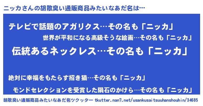 | 男性向けラノベタイトル風あだ名 | 『ダンジョンにニッカを求めるのは間違っているだろうか』 |