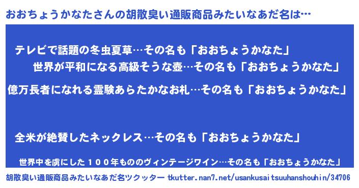 | 男性向けラノベタイトル風あだ名 | 『オオチョウカナタアートオンライン』 |