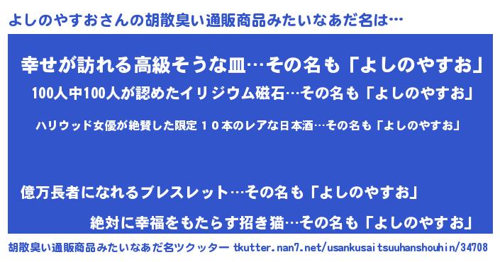 | 男性向けラノベタイトル風あだ名 | 『魔弾の王とよしのやすお』 |