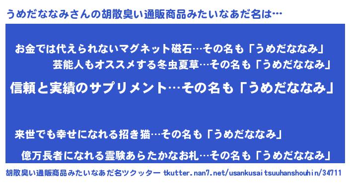 | 男性向けラノベタイトル風あだ名 | 『ダンジョンにうめだななみを求めるのは間違っているだろうか』 |