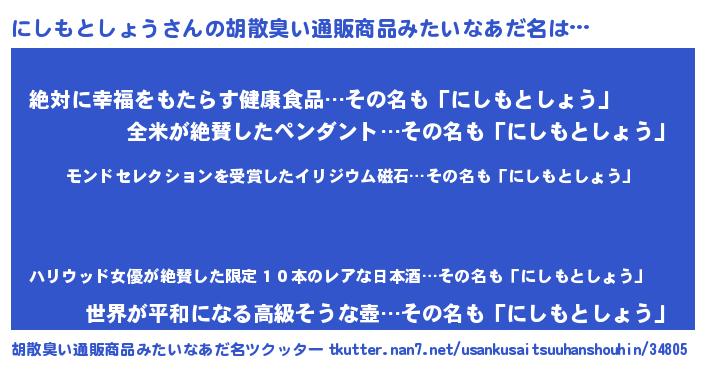 | 男性向けラノベタイトル風あだ名 | 『ノーゲーム・ノーニシモトショウ』 |