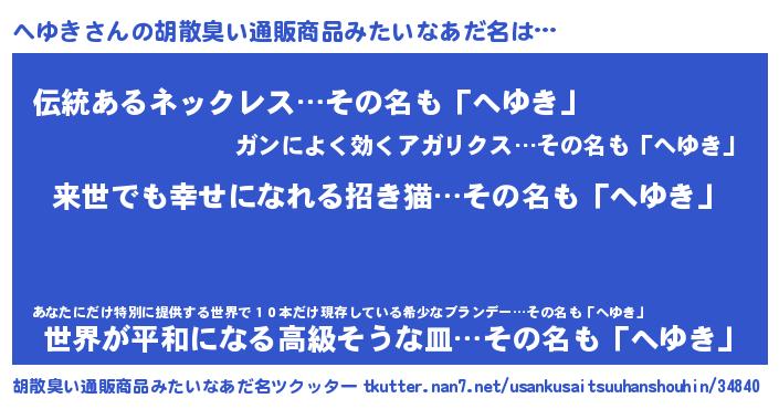 へゆきさんの胡散臭い通販商品みたいなあだ名をツクッター!
