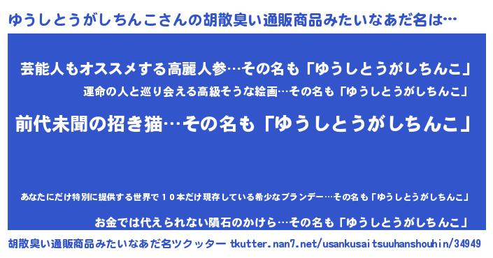 | 伝説のあだ名 | 『古文書に記された吟遊詩人ゆうしとうがしちんこ』 |