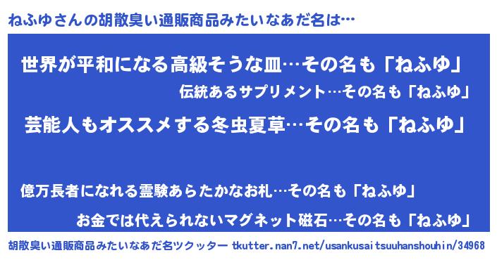 | 男性向けラノベタイトル風あだ名 | 『Re:ねふゆから始める異世界生活』 |