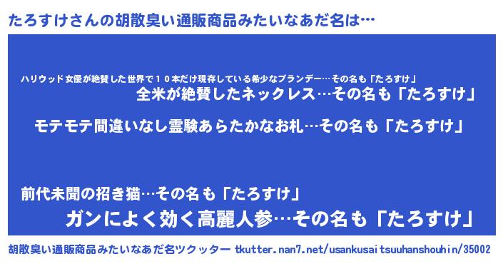| 男性向けラノベタイトル風あだ名 | 『たろすけの憂鬱』『魔弾の王とたろすけ』 |