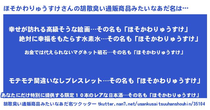 | 女子向けラノベタイトル風あだ名 | 『ほそかわりゅうすけ恋絵巻』 |