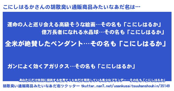 | 男性向けラノベタイトル風あだ名 | 『こにしはるかの嫁は女の子じゃないと思った?』 |