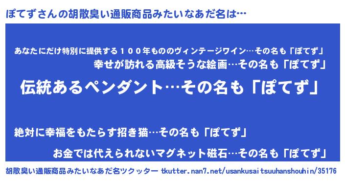 | 男性向けラノベタイトル風あだ名 | 『ダンジョンにぽてずを求めるのは間違っているだろうか』 |