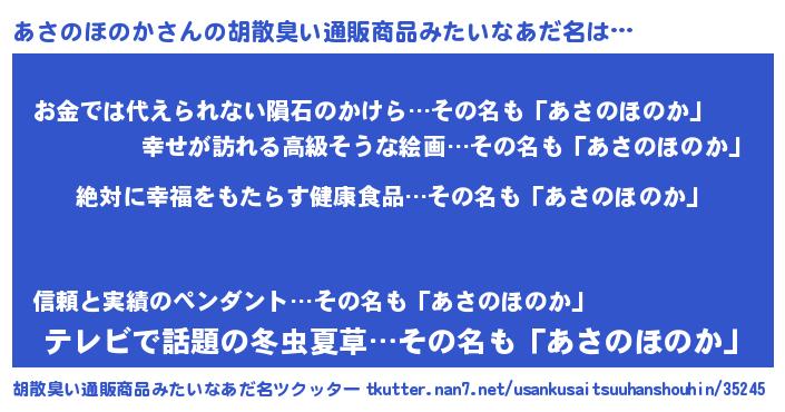 | ヘコむあだ名 | 『あさのほのか(笑)』『なまこ酢』 |
