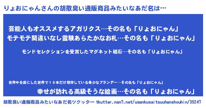 | 男性向けラノベタイトル風あだ名 | 『りょおにゃんに滅ぼされるだけの簡単なお仕事です』 |