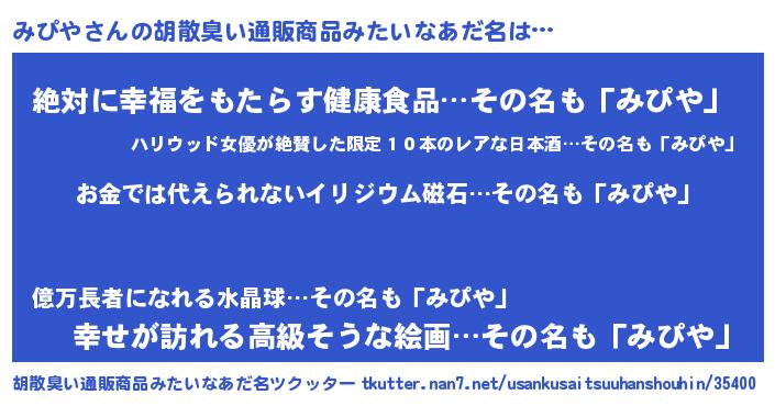 | ヘコむあだ名 | 『みぴや(笑)』『牛乳』『みぴにー』 |