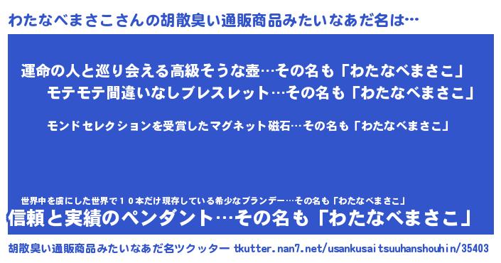 | 男性向けラノベタイトル風あだ名 | 『ノーゲーム・ノーワタナベマサコ』 |