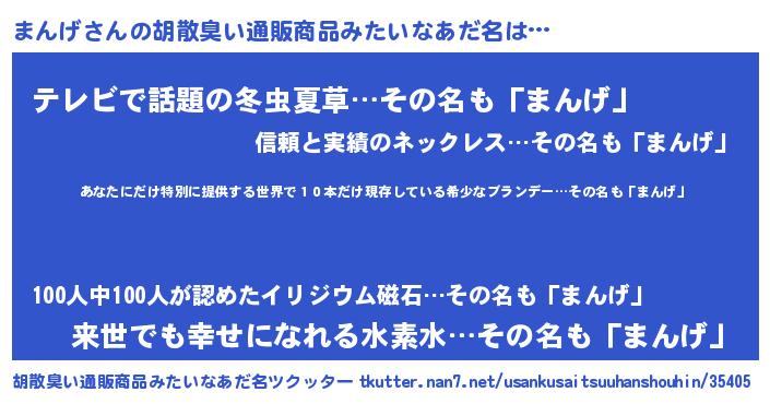 | 男性向けラノベタイトル風あだ名 | 『この素晴らしい世界にまんげを!』 |