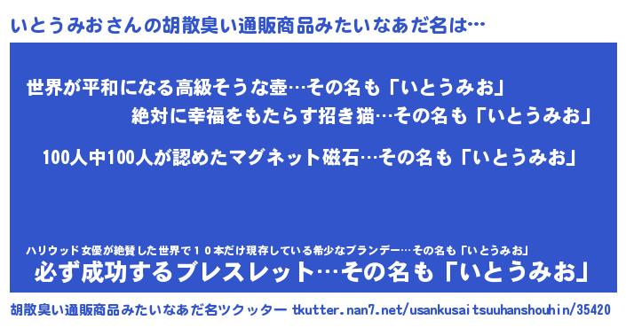 | 男性向けラノベタイトル風あだ名 | 『おまえをオタクにしてやるから、俺をいとうみおにしてくれ! 』 |