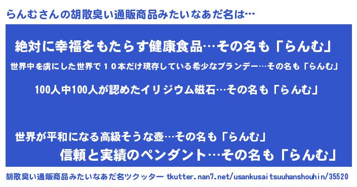 | 男性向けラノベタイトル風あだ名 | 『おまえをオタクにしてやるから、俺をらんむにしてくれ! 』 |