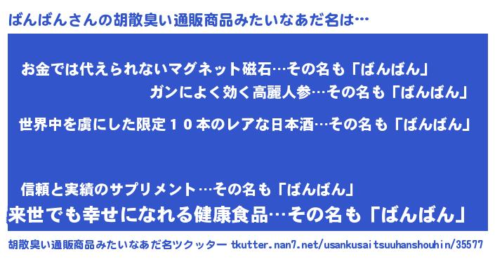 | 意味不明あだ名 | 『住所不定無職ばんばん(47歳)』 |