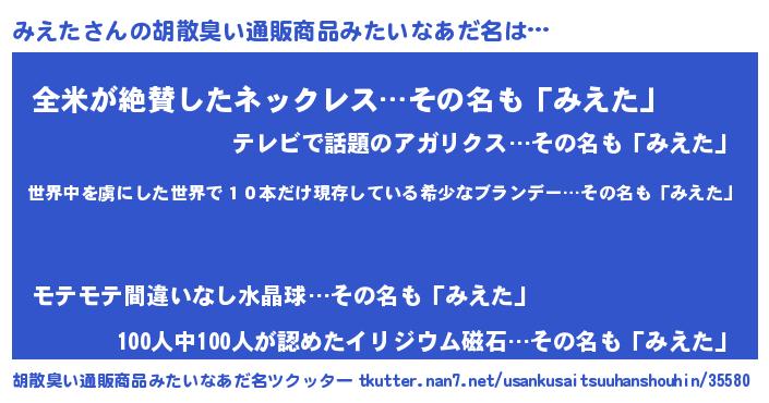 | 意味不明あだ名 | 『住所不定無職みえた(74歳)』『自称みえた』 |