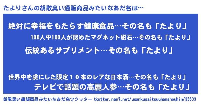 | 意味不明あだ名 | 『とにかく怪しいたより』『自称たより』 |