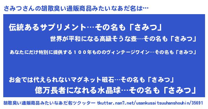 男性向けラノベタイトル風あだ名 | 『この素晴らしい世界にさみつを!』 |