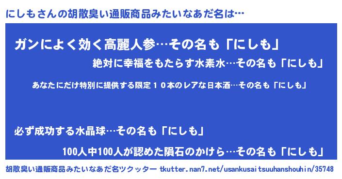 | 男性向けラノベタイトル風あだ名 | 『この素晴らしい世界ににしもを!』 |