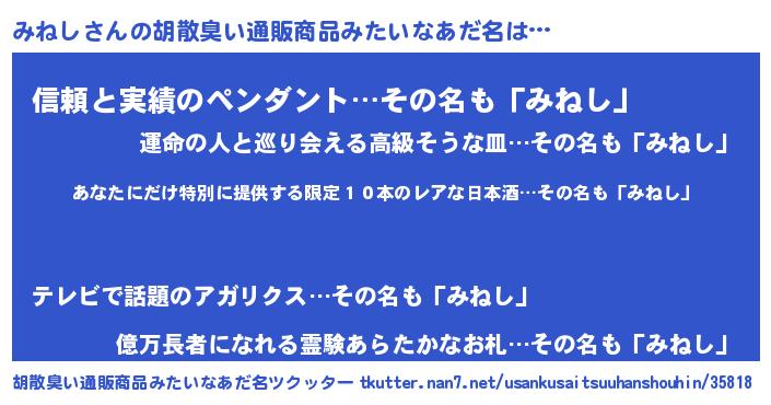 | 意味不明あだ名 | 『住所不定無職みねし(53歳)』『自称みねし』 |