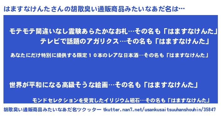 | 男性向けラノベタイトル風あだ名 | 『はますなけんた~年齢イコール彼女いない歴の魔法使い~』 |