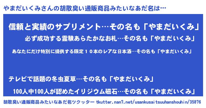 | 男性向けラノベタイトル風あだ名 | 『やまだいくみ~年齢イコール彼女いない歴の魔法使い~』 |
