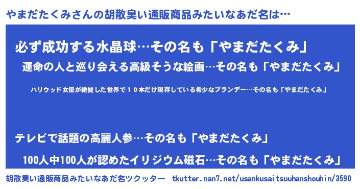 | 意味不明あだ名 | 『住所不定無職やまだたくみ(91歳)』 |