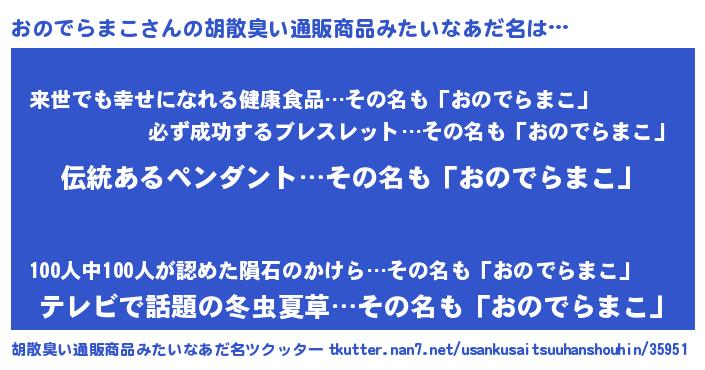 | 男性向けラノベタイトル風あだ名 | 『おのでらまこの嫁は女の子じゃないと思った?』 |