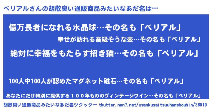 | 男性向けラノベタイトル風あだ名 | 『ベリアルという概念が存在しない退屈な世界 』 |