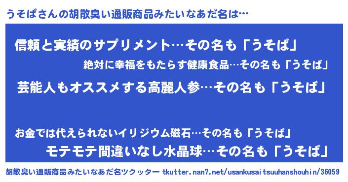 | 意味不明あだ名 | 『自称うそば』『とにかく怪しいうそば』 |