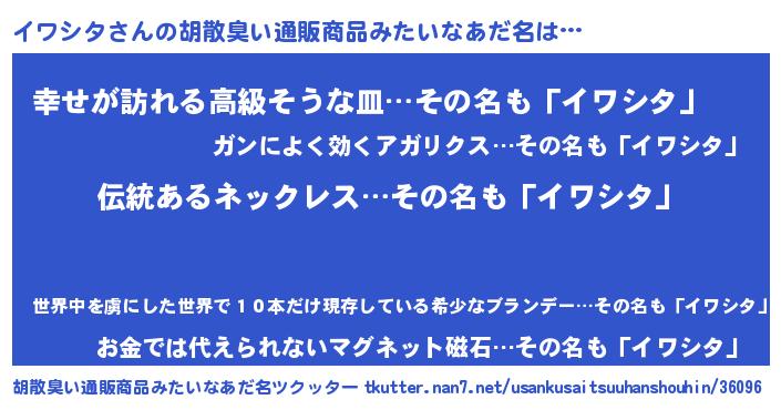 | 男性向けラノベタイトル風あだ名 | 『イワシタの嫁は女の子じゃないと思った?』 |