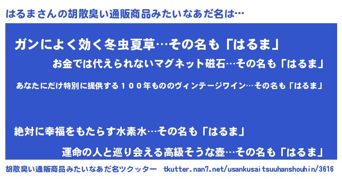 | 意味不明あだ名 | 『住所不定無職はるま(7歳)』『自称はるま』 |