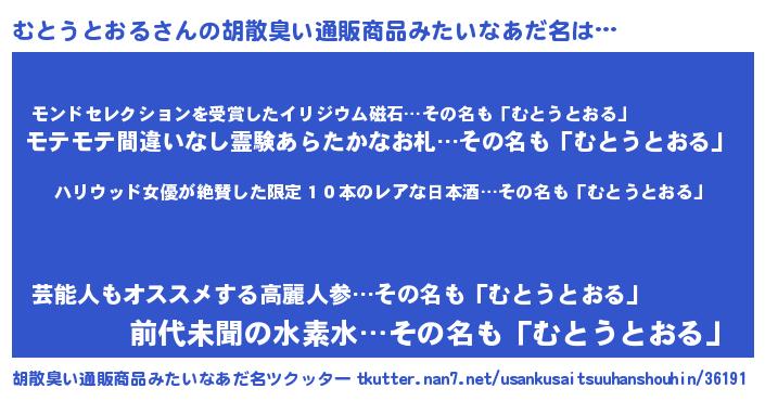 | 意味不明あだ名 | 『住所不定無職むとうとおる(62歳)』 |