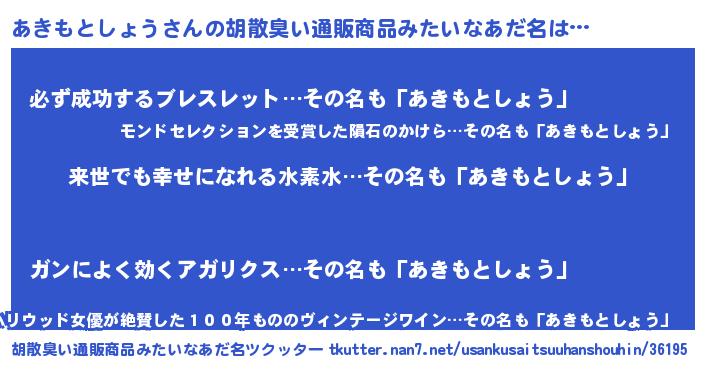 | 男性向けラノベタイトル風あだ名 | 『あきもとしょうに滅ぼされるだけの簡単なお仕事です』 |