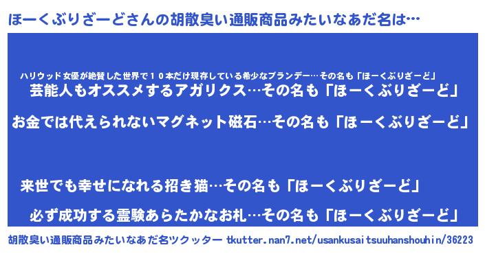 | 男性向けラノベタイトル風あだ名 | 『転生したらほーくぶりざーどだった件』 |