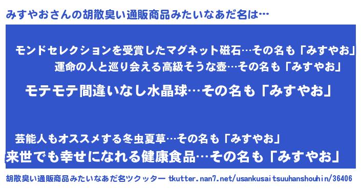 | ヘコむあだ名 | 『みすにゅー』『みすやお(震え声)』 |