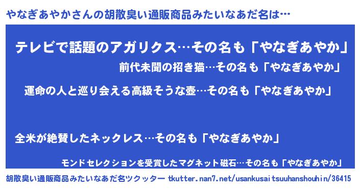 | ヘコむあだ名 | 『レバニラ』『やなぎあやか(笑)』 |