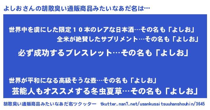 | 男性向けラノベタイトル風あだ名 | 『よしおの憂鬱』『魔弾の王とよしお』 |